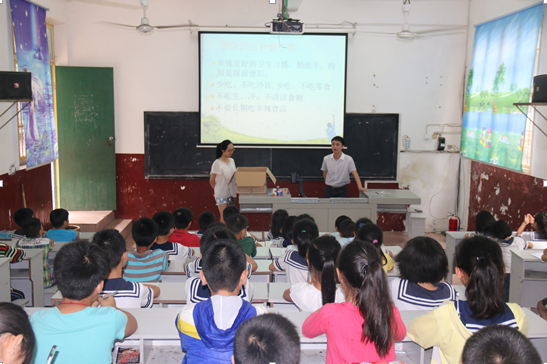 13级研究生肖竹和惠石生为彭德怀希望小学的留守儿童上了两堂趣味横生的课程,主题分别是:小学生健康和卫生知识宣讲、小学生意外伤害防范与处理宣讲。他们通过自己所学的医学知识,将生动、有趣的健康卫生知识与安全教育传达给小学生们。宣讲中不断听到小学生的欢笑声和整齐的回答声,气氛十分活跃,使小学生们轻松快乐的掌握了健康卫生知识。讲座过后,向小学生们颁发了精美的纪念品,献出我们公共卫生学院的一份小爱心。这次活动得到了彭德怀小学师生们的一致好评,并赠予91直播