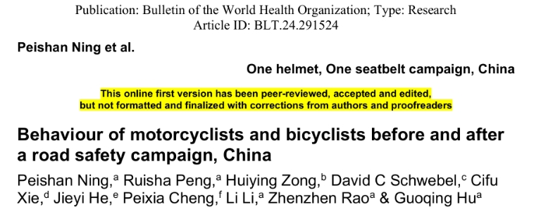 流行病与卫生统计学系胡国清教授团队的最新研究成果“Behaviour of motorcyclists and bicyclists before and after a road safety campaign, China”在国际公共卫生领域权威期刊、世界卫生组织官方期刊《Bulletin of the World Health Organization》(IF=8.4,SCI分区1区,Top 5%期刊)发表。91直播