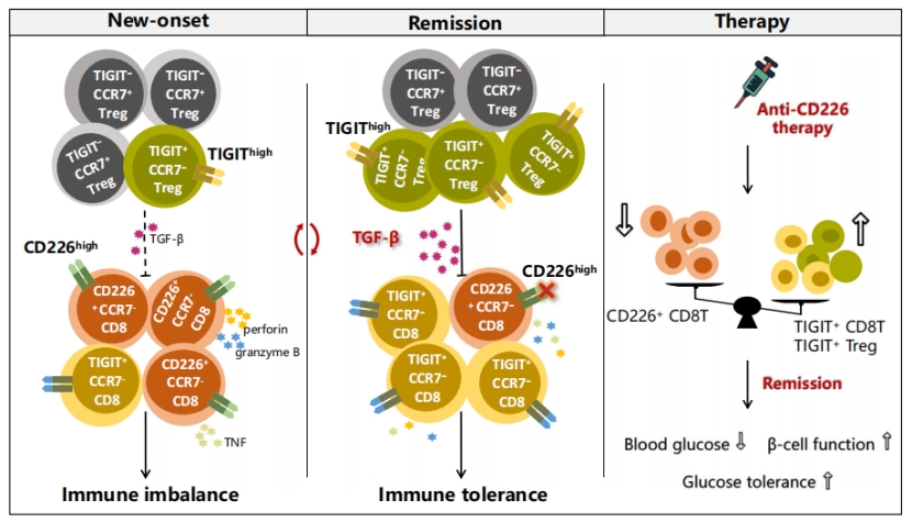 这些发现揭示了一个先前未知的免疫细胞新亚群的动态相互作用,即TIGIT+Treg-TGF-β-CD226+CD8+ T,该作用轴不仅调控免疫环境的稳态,还为T1D提供了一种潜在的治疗靶点。未来,基于这一机制的免疫治疗策略有望为T1D患者带来福音。