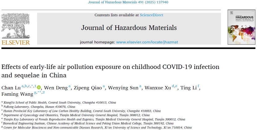 湘雅公共卫生学院劳动卫生与环境卫生学系路婵教授团队与西安科技大学OHRG团队负责人王发明教授的合作研究成果“Effects of early-life air pollution exposure on childhood COVID-19 infection and sequelae in China”在国际环境健康领域权威期刊《Journal of Hazardous Materials》(IF:12.2,JCR Top 3%,中科院1区TOP)以Research Paper发表。路婵教授为该文第一作者和共同通讯作者,王发明教授为该文共同通讯作者,91直播