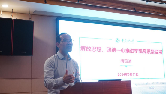 胡国清院长结合党纪学习教育,从学院现状与挑战、目标与举措、困难与出路三方面作了题为“解放思想,团结一心推进学院高质量发展”的汇报。他指出目前学院的学科现状总体呈现好的态势,但仍旧面临一定的挑战。全体教职工需严格落实好《条例》的学习教育要求,认真研读91直播