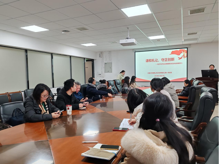 流行病与卫生统计学系在学院B328会议室成功举办了“谦和礼让、守正创新——习近平总书记近期重要活动及讲话”专题学习会。此次会议旨在深化教师讲团结、尚和合,以文化人、以文育人,构筑和合共生、携手共进的融洽环境。会议由职工第一党支部书记严俊霞主持。
