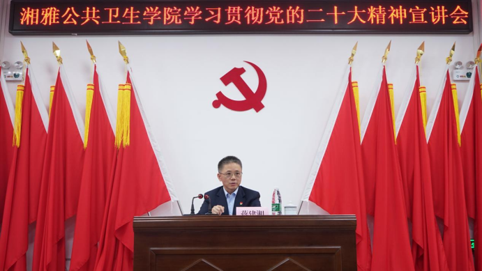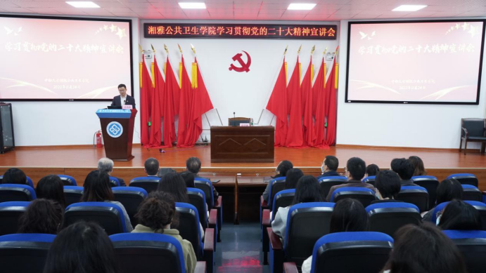 宣讲会第一阶段,雷先阳以《深入学习宣传贯彻党的二十大精神,奋力推进学校事业内涵式高质量发展》为题宣讲了党的二十大精神。