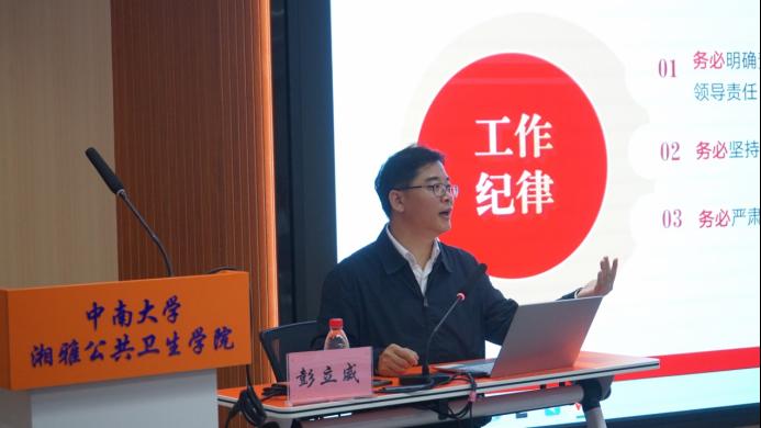 领导干部和广大师生在建设高水平公共卫生学院中应有的历史使命和责任担当。彭立威还围绕学习贯彻习近平新时代中国特色社会主义思想主题教育,结合正反典型案例,向与会人员宣讲党纪党规知识,勉励大家树立终身学习的思想理念,以学增智、以学铸魂、以学正风、以学促干。