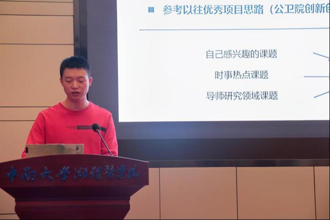 接下来,由学生代表们依次进行成果分享。首先,谭涛同学介绍了大创的基本情况和组队要求,分享了文献的查找、管理以及标书撰写的经验。