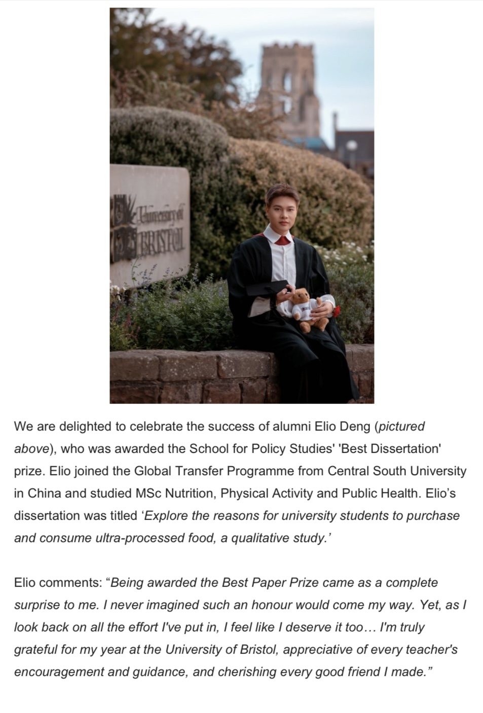 在布里斯托大学攻读Nutrition, Physical activity and Public health专业期间,邓佩凭借其优异的学术表现和突出的研究能力,荣获Distinction学位(一等荣誉学位)。他的论文“Explore the reasons for university students to purchase and consume ultra-processed food, a qualitative study”被布里斯托大学政策研究学院评为2023年年度最佳论文,并登上学校校报。
