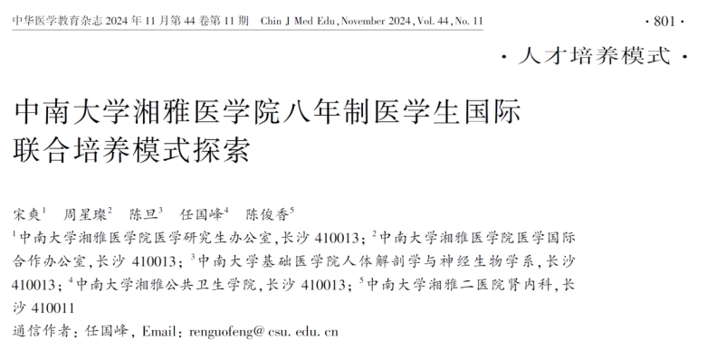 湘雅医学院八年制医学生国际联合培养模式探索”一文在《中华医学教育杂志》2024年11期作为第一篇文章发表,湘雅医学院研究生办宋爽老师为第一作者,91直播