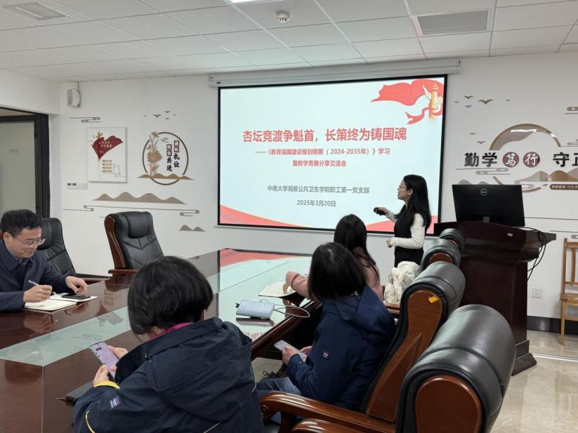 2025年3月20日下午,流行病与卫生统计学系全体教职工齐聚学院B328会议室,召开了一场主题为“杏坛竞渡争魁首,长策终为铸国魂”《教育强国建设规划纲要(2024-2035年)》学习暨教学竞赛分享的交流会。本次会议由系主任吴心音主持,学院党委书记雷先阳亲临现场并给予指导。