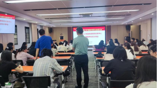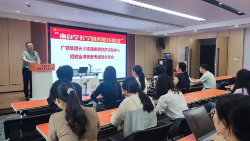 邀请中国铁路广州集团有限公司长沙铁路疾病预防控制中心人事劳资科科长刘红、团支部书记曾婷等五位校友来院为在读学弟学妹进行广州铁路局疾控所招聘宣讲及备考经验分享,开展访企拓岗就业专项活动。会议由学工办副主任尹逊强老师主持,学院近100名2024届、2025届研究生、本科生现场聆听与学习,学院党委书记雷先阳出席并致辞。