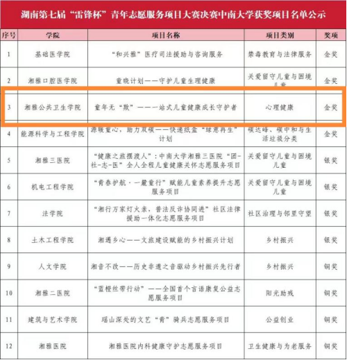 与湘雅二医院联合开展的项目《童年无“欺”——一站式儿童健康成长守护者》(指导老师:胡宓、程姣;项目负责人:郭伟光)经过层层选拔,荣获湖南省第七届“雷锋杯”青年志愿服务项目大赛金奖,为我校4个金奖项目之一。